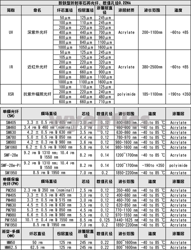 光纤纤芯可选择如下图表: