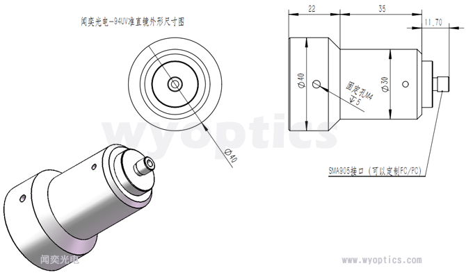 94UV 准直透镜设计用于耦合更大自由空间的光束到光纤中。 该准直透镜镜片直径30mm,焦距50毫米,适合用于户外长距离准直光,经测试,最长距离可达20米。