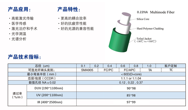 | FIB-UV200-2.0 | 200~1100nm | 深紫外石英光纤,200μm 芯径,2.0m 长度 | |