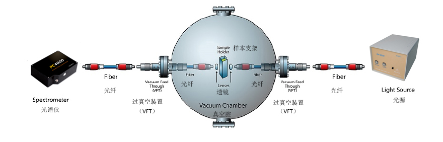 VFT光纤过真空装置的光纤直径有50μm、100μm、200μm、400μm、600μm和1000 μm可选;波长可选UV200~1100nm和IR400~2500nm,可选配SMA905或者FC接头。